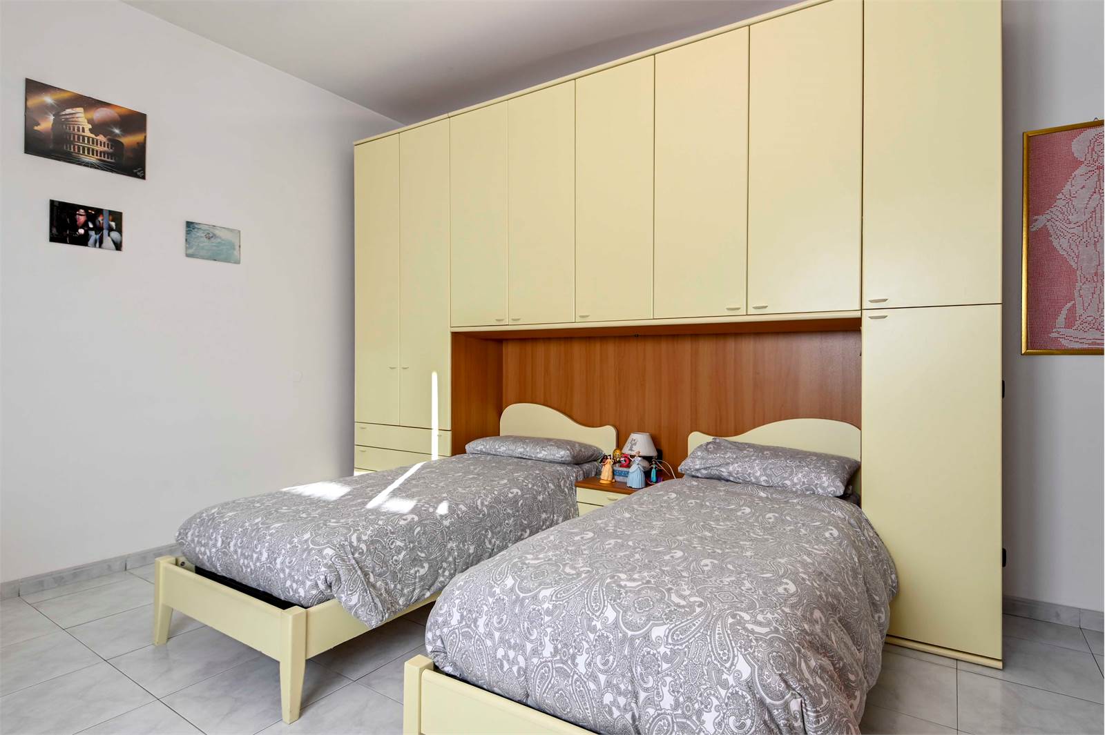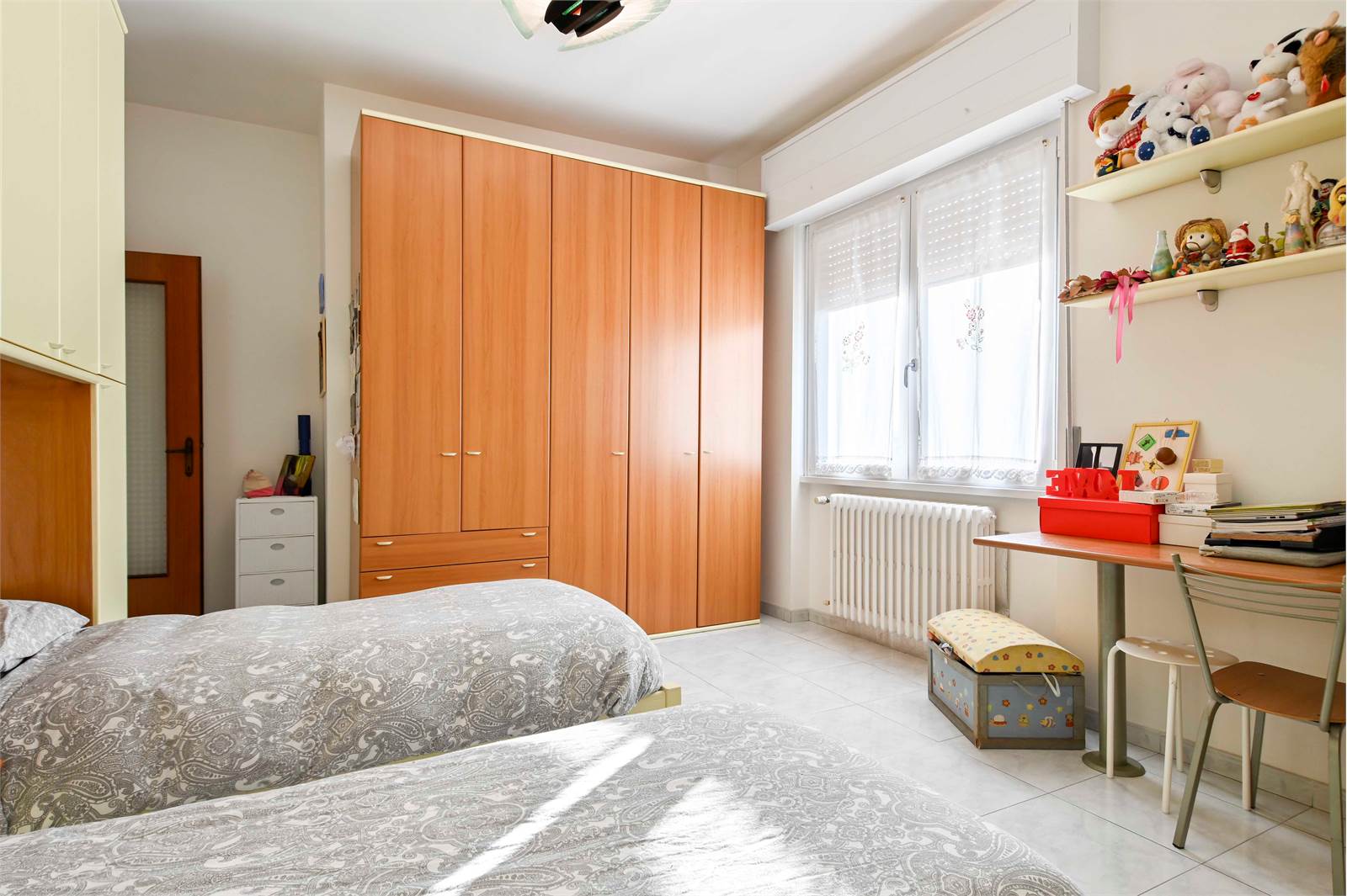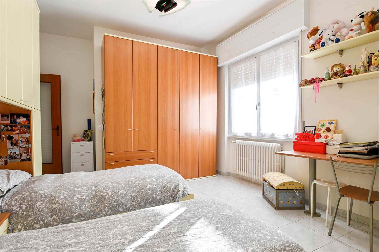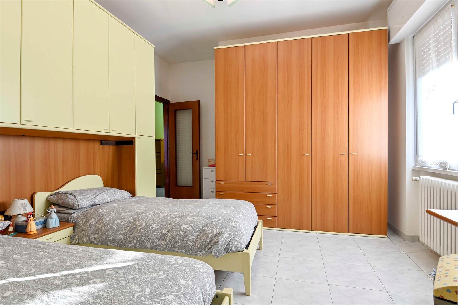 La zona notte, separata da un pratico secondo disimpegno, comprende una camera matrimoniale, una seconda camera da letto anch'essa matrimoniale, un bagno finestrato con doccia e vasca e un utile ripostiglio.