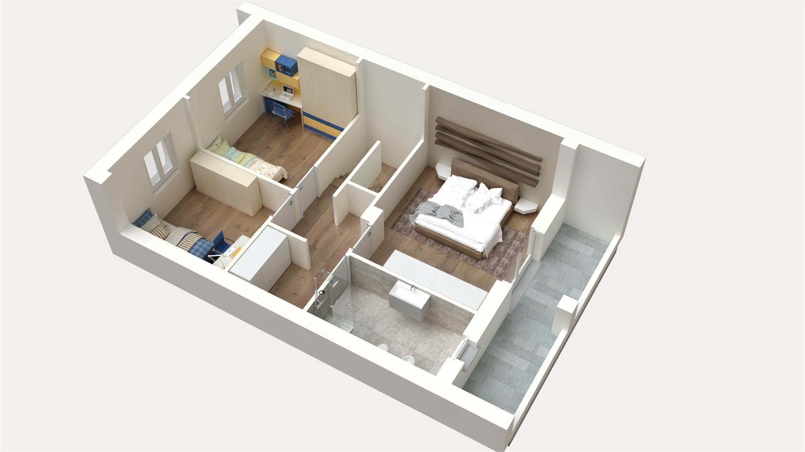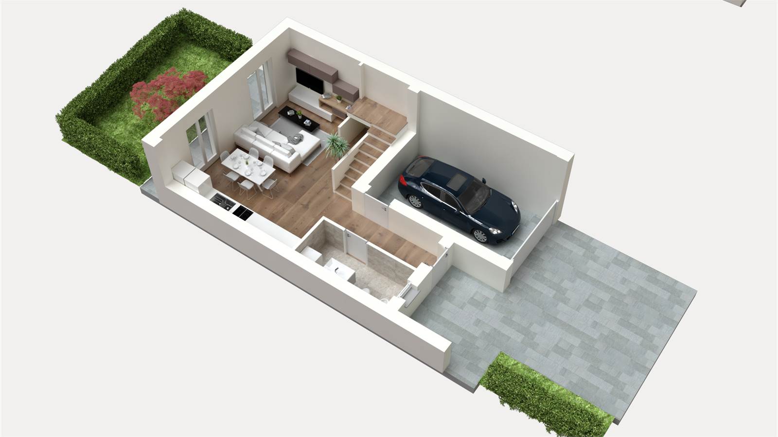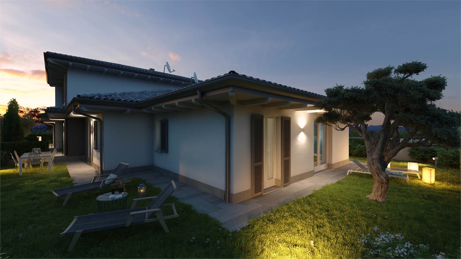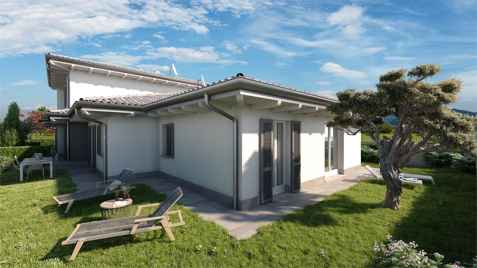 Da progetto, gli spazi saranno così organizzati: ampio e luminoso soggiorno con cucina a vista, disimpegno, bagno/lavanderia, zona notte composta da una spaziosa camera matrimoniale, due generose camere singole e un secondo bagno. Il tutto completato da un box e da un giardino privato.